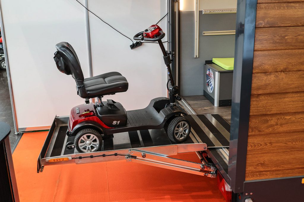ブースには、スロープタイプとリフトタイプが展示されていた。スロープタイプは長めのスロープを展開し、緩やかな傾斜で自力で乗降しやすい設計となっている。補助を最小限にし、みんなでアウトドアの時間を楽しめる工夫が随所に見られる。一方のリフトタイプは限られたスペースでも昇降でき、駐車場や狭いキャンプ場での使用に対応。どちらも車いす使用者が自由に移動できる設計で、乗降のストレスを最小限に抑えていた。