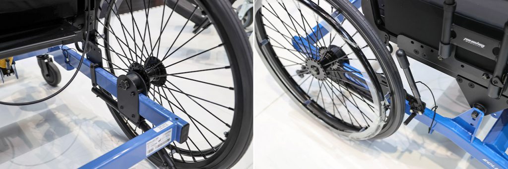 実際に触れてみると、介助者側への配慮も随所に感じられた。ハンドルの高さは工具なしで調整でき、ブレーキレバーは大型でしっかり握り込める。フットサポートの高さ調整や取り外しも容易で、乗り降りの安全性が高い。さらに後輪のキャスター構造は、方向安定性と回転の軽さを高いレベルで両立。270kgのユーザーを乗せた状態でも、驚くほど軽やかに方向転換できるという。担当者によれば「重量に耐えるため剛性を上げると操作が重くなりがちですが、支点位置やタイヤ圧まで最適化しています」とのこと。