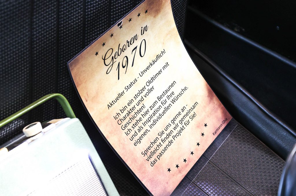 フォルクスワーゲンのシャシーにイタリアンデザイン、ドイツの名門コーチビルダーであるカルマン社の製作技術を組み合わせた、1950年代から70年代を代表する美しいスポーツカー。1970年式のこのクルマは、47馬力を発生する1.6Lエンジンにオートマチックトランスミッションが組み合わされる。室内にはハンドコントロールバーが装着されているが、その質感は内装と自然に調和しており、後付け感を感じさせない。なお、本車両は非売品として参考出展されていた。