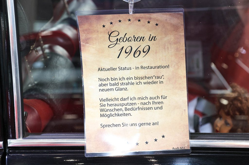 戦戦後、アウディが現在の「Audi」というブランド名を再び冠して発売した最初のモデルシリーズ。シンプルで機能的なスタイリングを特徴とし、その後のアウディデザインの礎となった。展示車両は1969年モデルで、現在レストア中。この車両をベースに、オーナーの希望に応じたカスタム計画が紹介されていた。